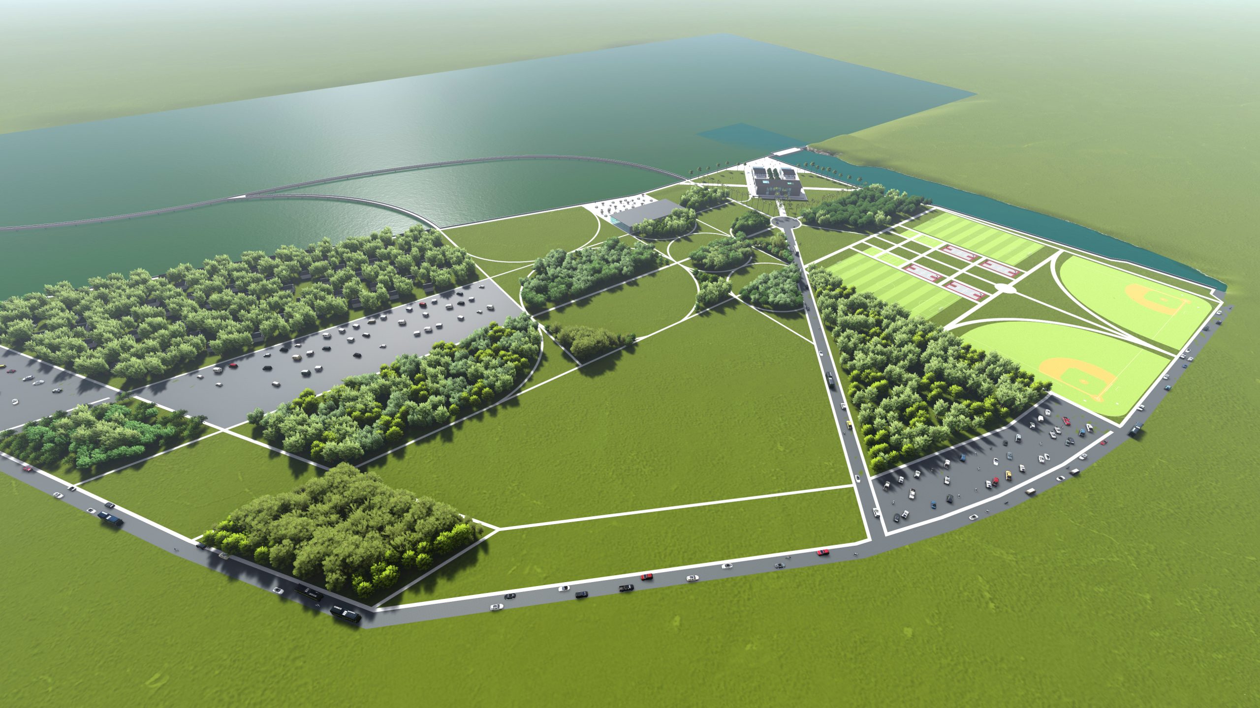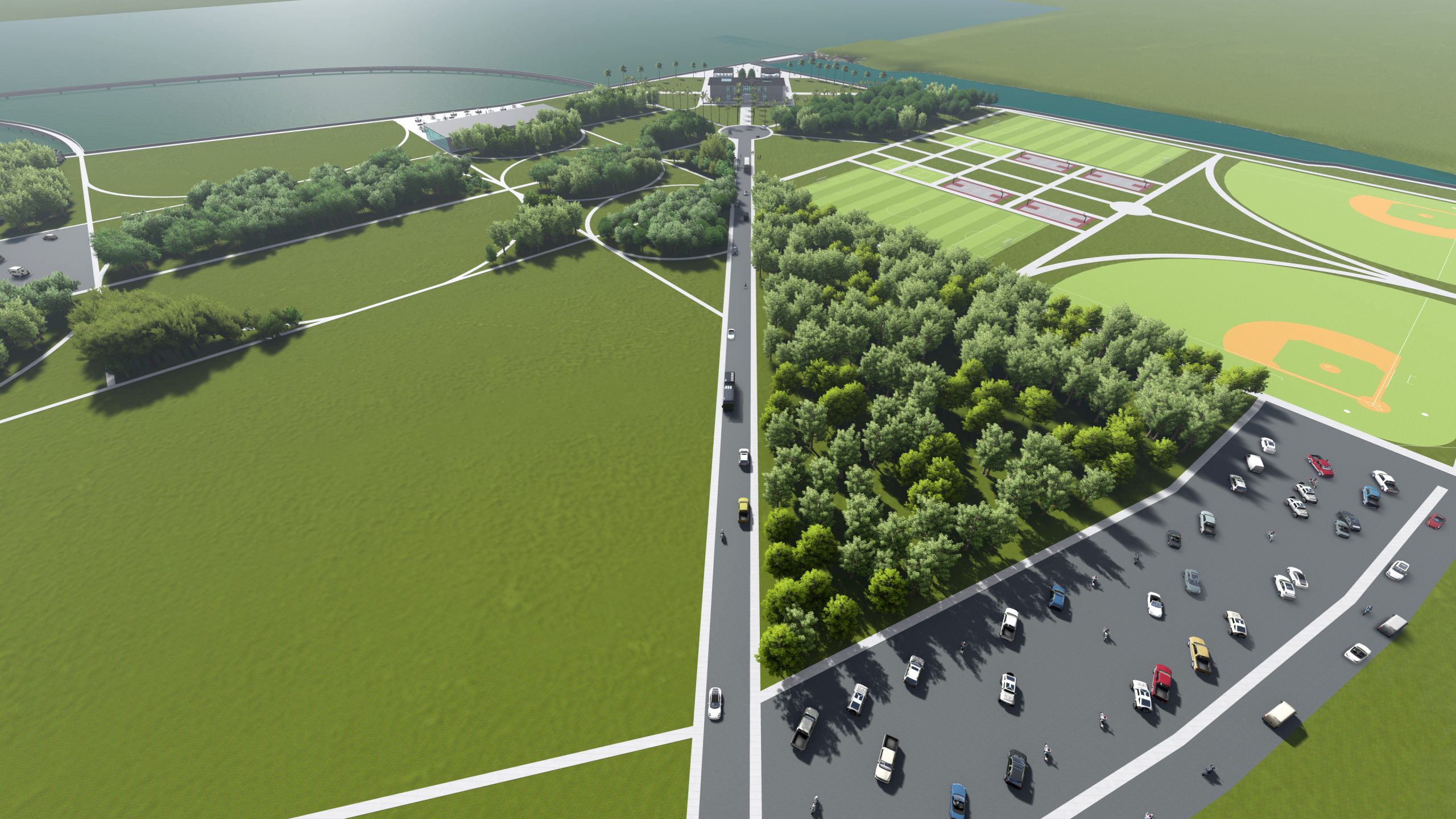 A structured promenade much like the linear walks found in Italian plazas (passaggiata) will establish the site as the bay’s landmark. Providing a couple of restaurants that take advantage of the bays’s beautiful views will further support nighttime activity. Small shops will accommodate all visitors seeking quick snacks and bike rentals. The addition of sports fields will further encourage the community to remain active all day long.