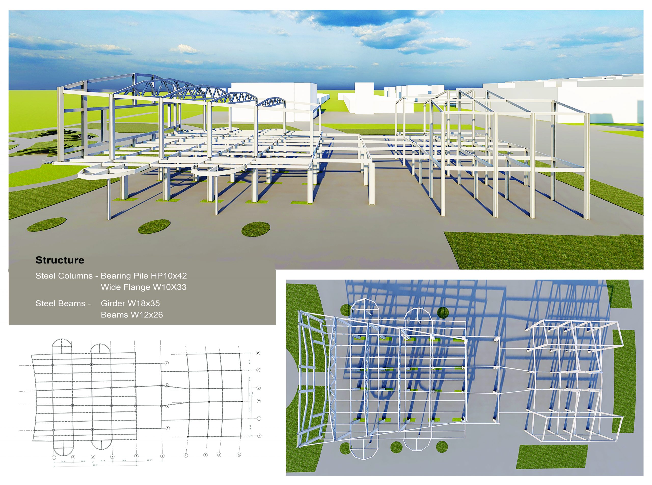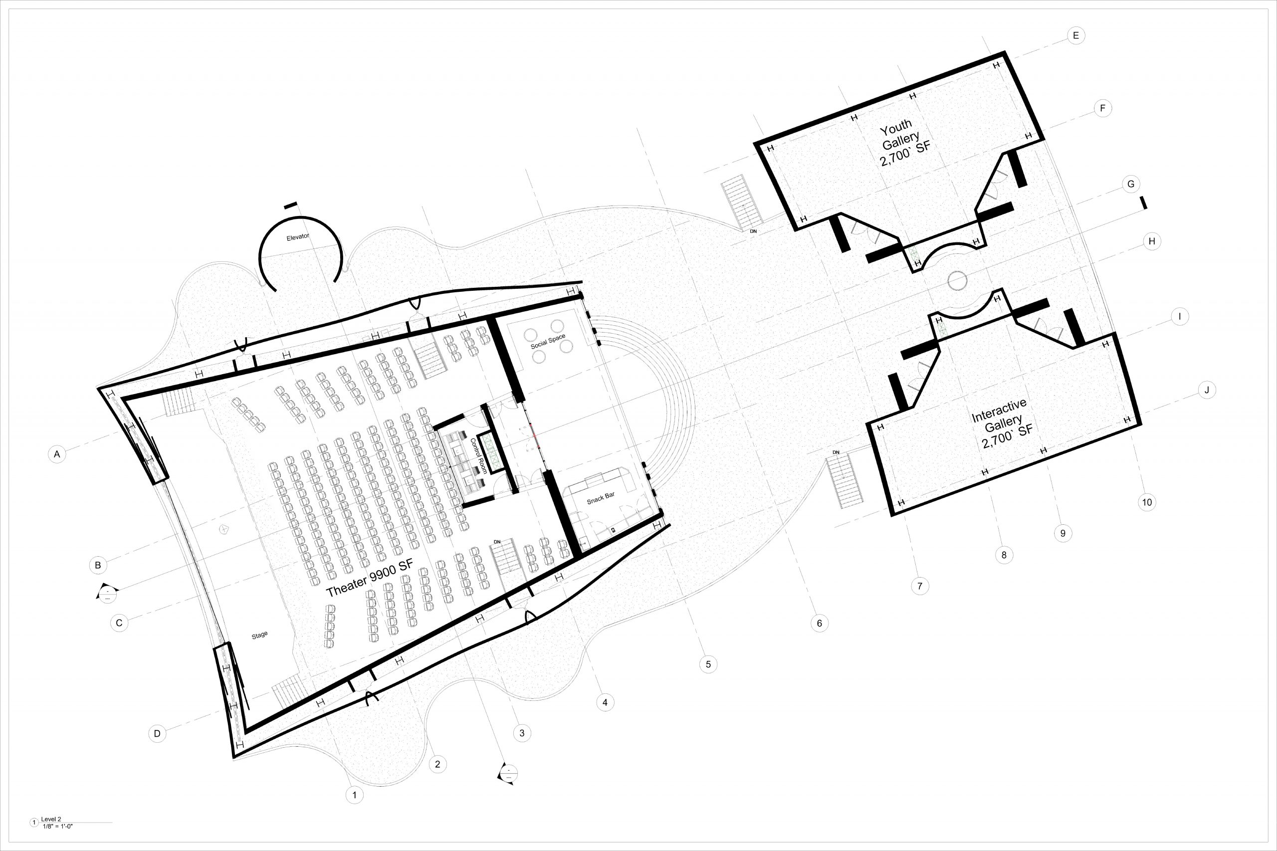 Note: Due to time restraints, the three North and four South masses were not developed. Focused on site, landscape and two center masses containing four galleries and a communal theater.